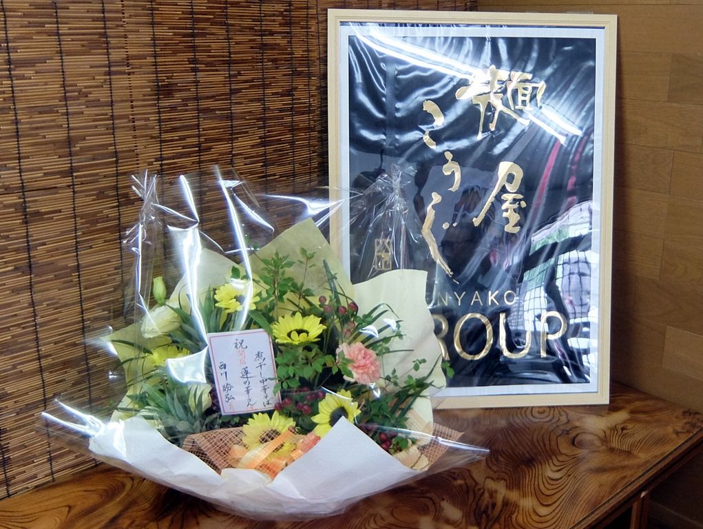 店頭に、「大勝軒てつ」からの開店祝いの大きな花輪。