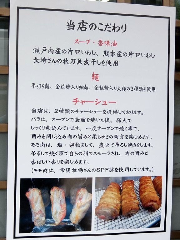 店頭掲示のこだわりを読みながら開店を待ちます。スープ・香味油は瀬戸内産片口いわし、熊本産片口いわし、長崎産秋刀魚煮干し。麺は平打ち麺、全粒粉入り細麺、全粒粉入り太麺の3種類。チャーシューは、オーブンで焼いて煮込んだバラ肉、モモ肉は直火で吊るし焼きの2種類。モモ肉は常用牧場のSPF豚。