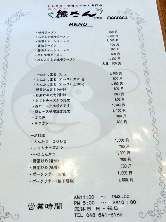 メニューの透かしは熊さんのイラストw それから、前店「cafe manracu」の「manracu」の文字が店名横に入っていますが、気づいたのは記事執筆時。なので関係は不明(^_^;)