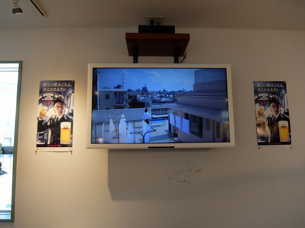 厨房は店主さんとサポートの男性の2名、ホール担当の女性で、スタッフさんは総勢3名体制。壁面にはグラビアアイドルのサイン。