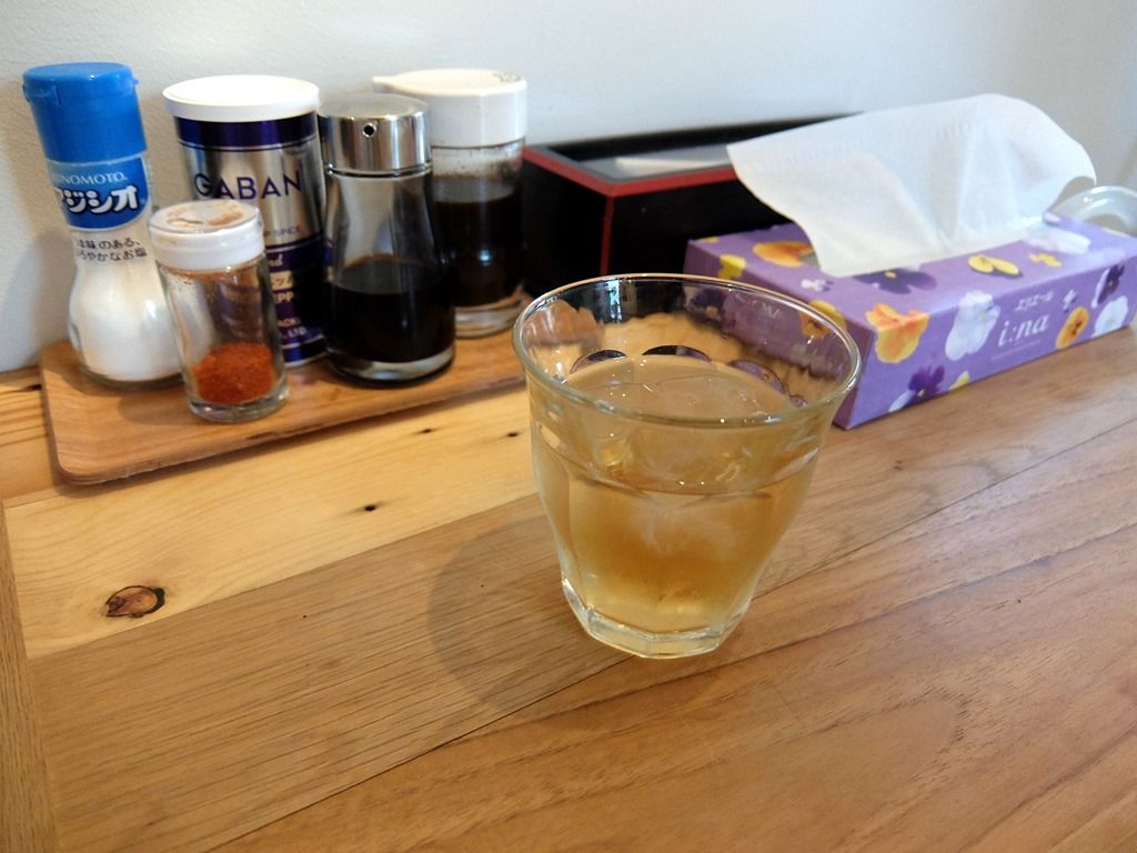 箸は割り箸。卓上調味料は、アジシオ、胡椒、一味唐辛子、醤油、ソース。ウェルカムドリンクは、冷たい麦茶。