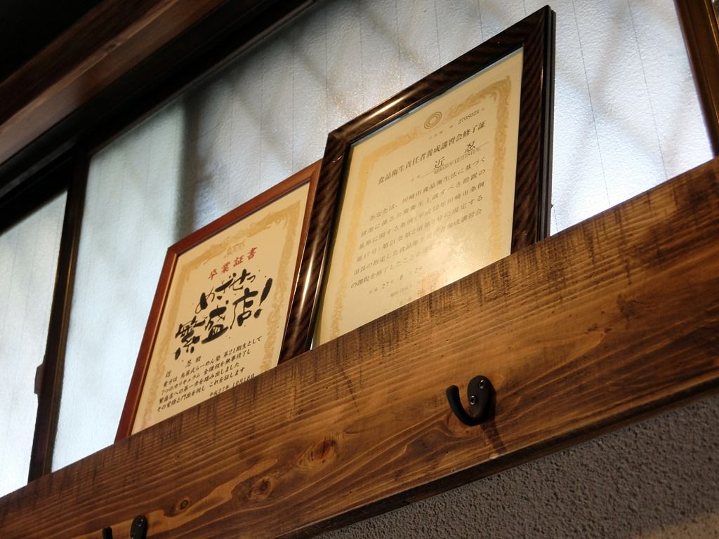 厨房には、店主さんとサポートの男性の2名体制。壁面には、鳥居塾の卒業証書が額縁入りで掲示。