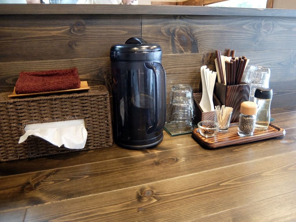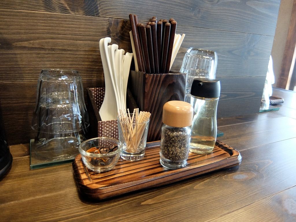BGMはJ-Pop。箸は洗い箸と割り箸のW装備。卓上調味料はミックスペッパー、酢。