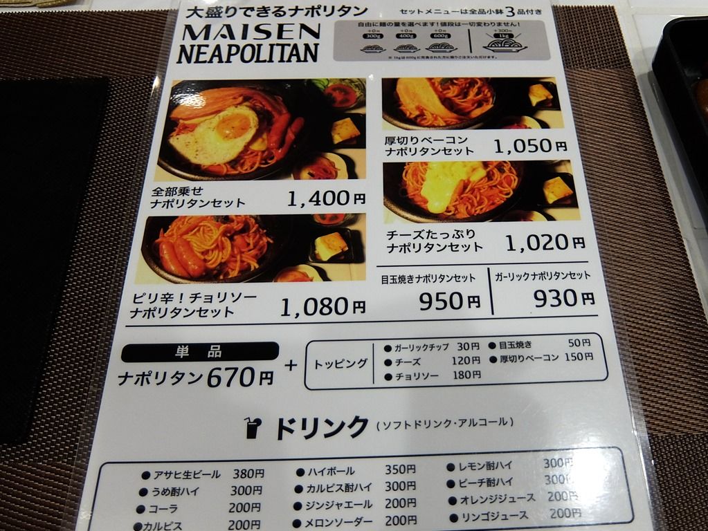 メニュー裏はナポリタン。カレー側の写真は綺麗だけど、ナポリタン側の画像が色被り過ぎてて美味しそうに見えないのが残念(^_^;) ナポリタンにはレディースセットもあって、女性にはメニューがもう1枚渡されてました。