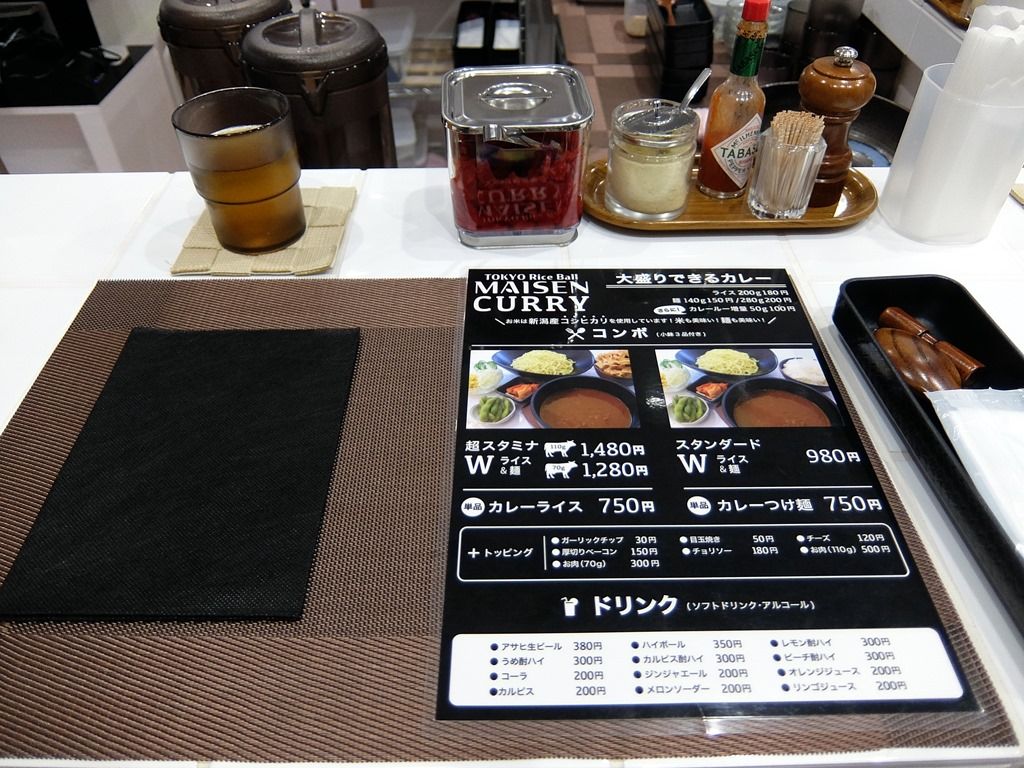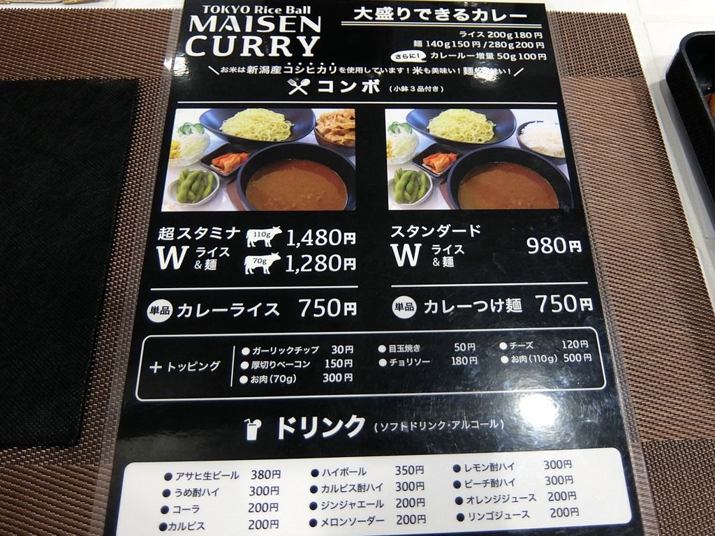 券売機はなく後会計制。主なメニューは、カレーライス750円、カレーつけ麺750円、スタンダードW(ライス&麺)980円、超スタミナW(ライス&麺) 牛70g1280円・牛110g1480円、他。ライス&麺のコンボには、小鉢3品付き。