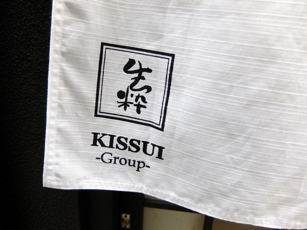各線大雨の影響で電車遅延、定刻に10分遅れで到着。もちろん既に絶賛営業中。暖簾には「生粋 KISSUI –Group-」のロゴ。