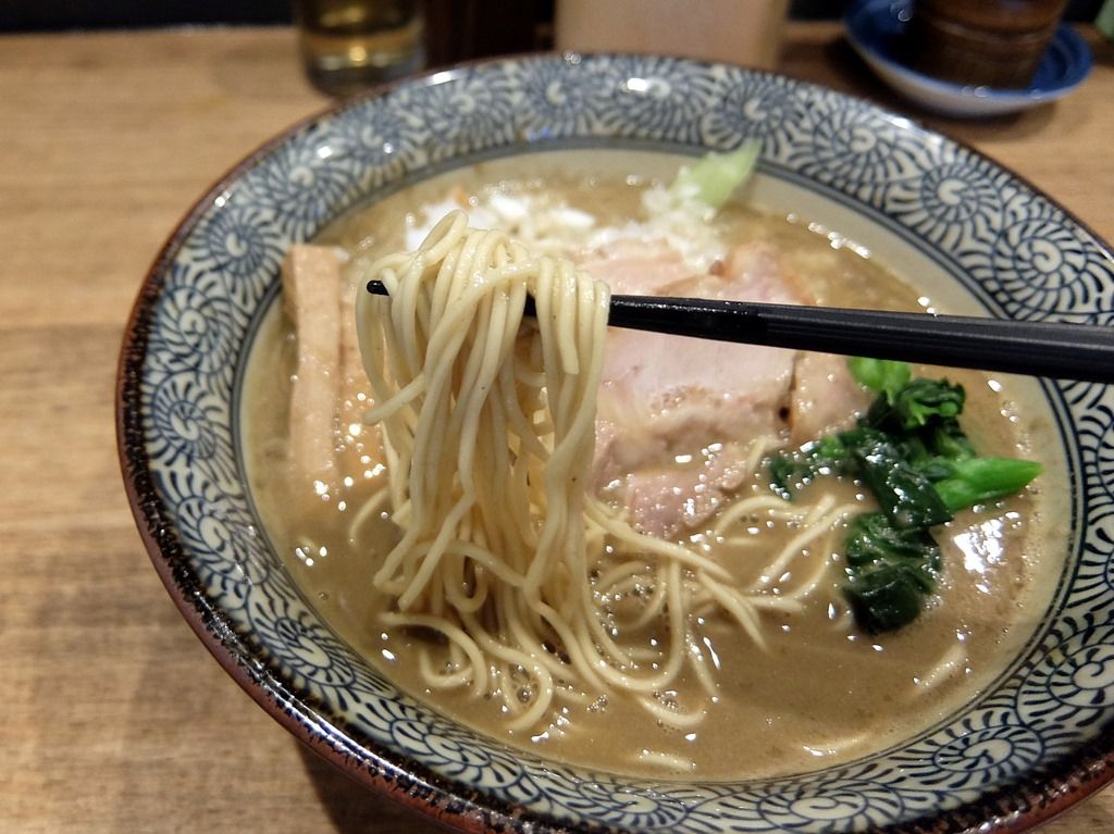 スープば、どろどろの濃厚白湯煮干し醤油味。ドロ系煮干ラーメンを提供する幾つかの店では、濃厚鶏白湯に煮干を合わせたものが主流。こちらは未確認ですが、そういった構成かな!?セメント色のいかにも煮干しが濃そうなスープは、まさに煮干しガッツリ!酸味やエグみも出ていて、食べ手を選ぶ仕上がり。結構ショッパイ気もしますけど、激ニボはこれ位が普通かな!?煮干濃度は申し分なく、ニボラーにも満足出来るクオリティ!もちろん美味しい!