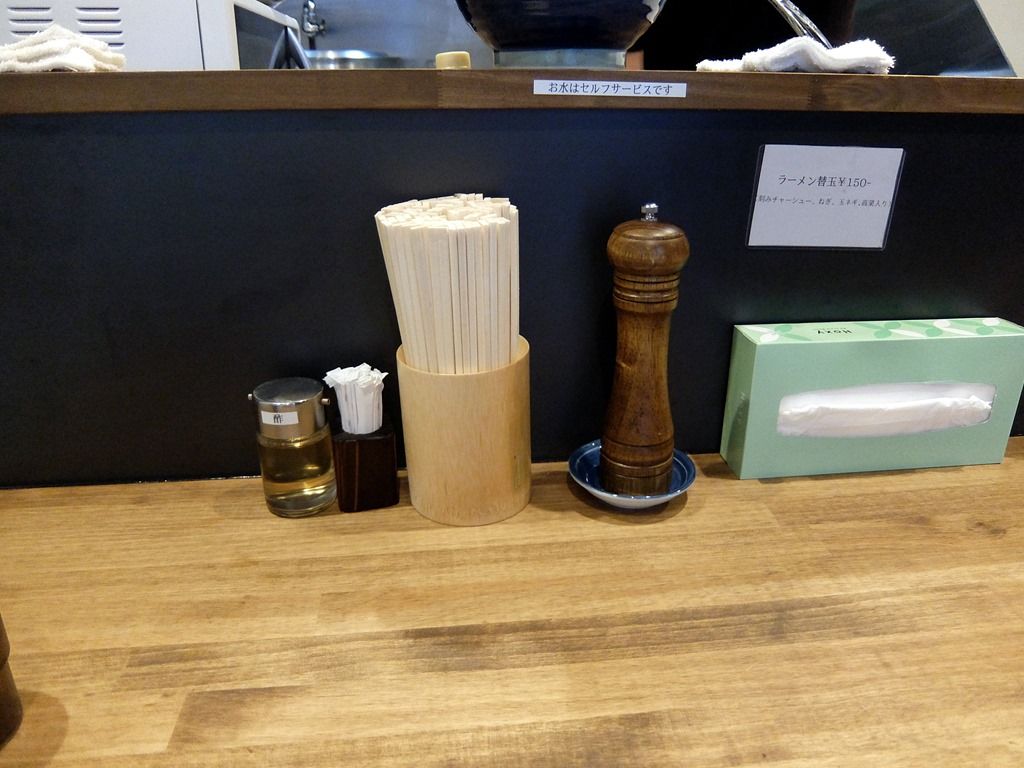 厨房には店主さん、ホール担当男性スタッフの2名体制。お冷は、奥の給水器こらセルフで。BGMはラップ。箸は割り箸。卓上調味料は、ペッパーミル入り胡椒。