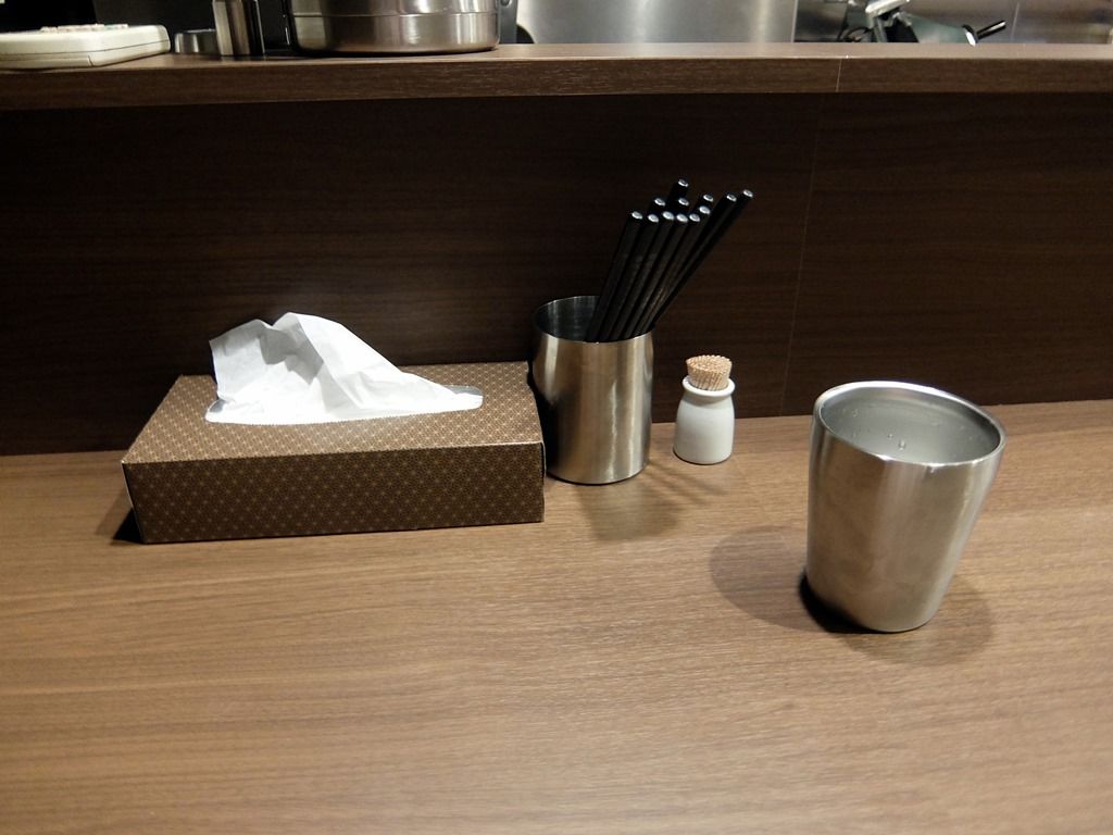 BGMはディズーアニメのサントラ的なミュージック。箸は洗い箸でエコ対応。卓上調味料は無し。お冷のグラスは、保冷効果の高い断熱タンブラー。