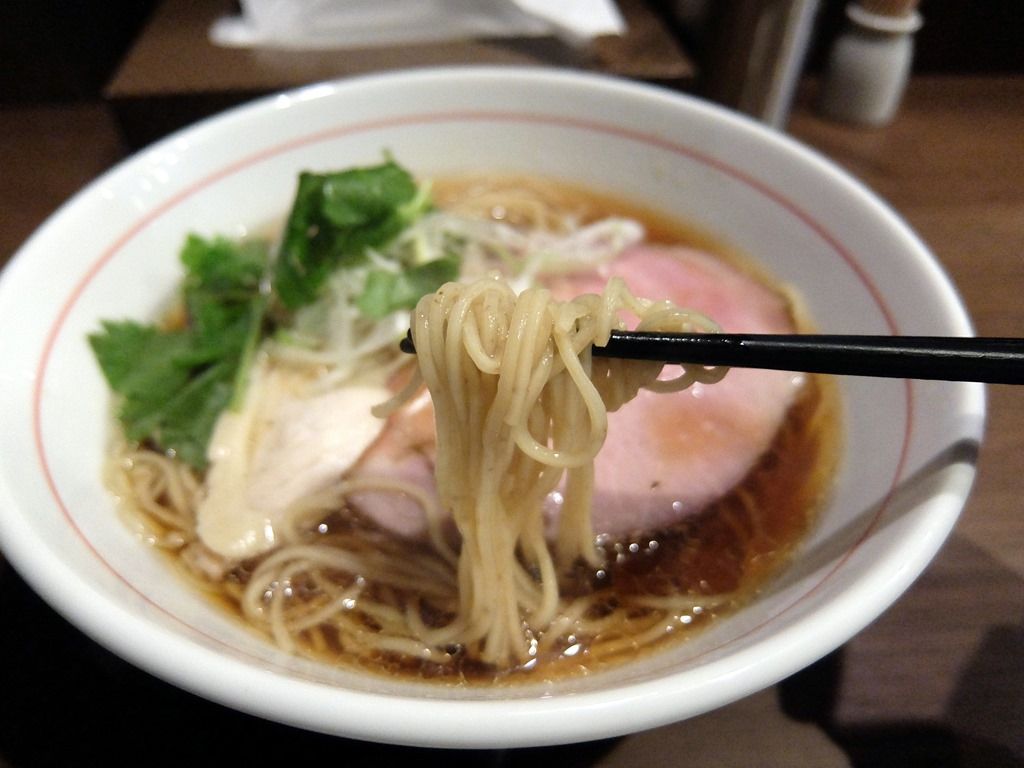 麺は、三河屋製麺のストレート中細タイプ。多分敢えてのチューニングかと思いますが、ディフォでやや柔らか目のゆで加減。そのソフトな麺が鮮烈な和風出汁に見事にマッチ!美味しい!ですが店主さんは、後のお客さんの麺固め注文にも快く応じてました(^_^;) 個人的にはこの一杯は、ゆで加減ノーマル推奨w