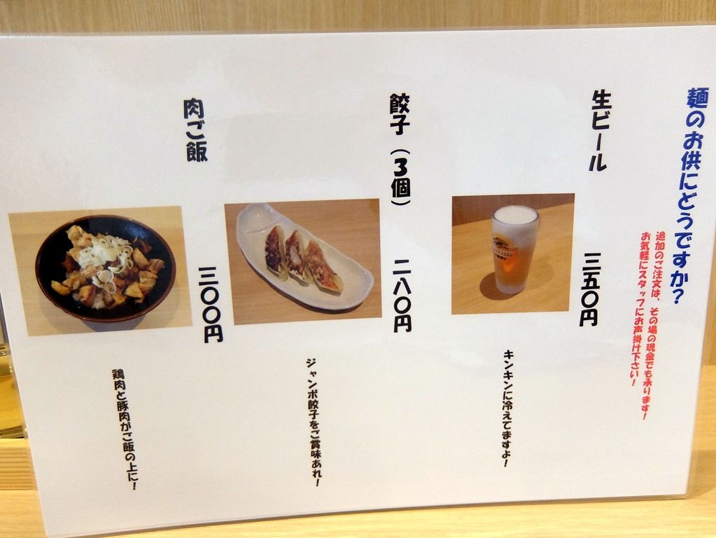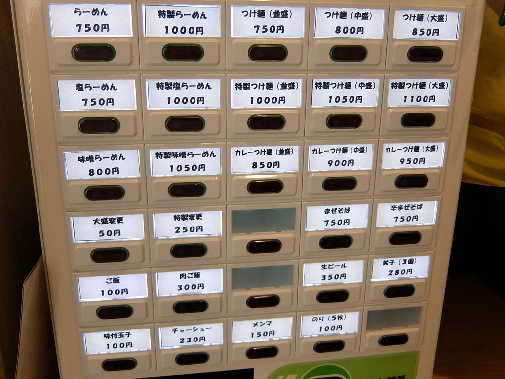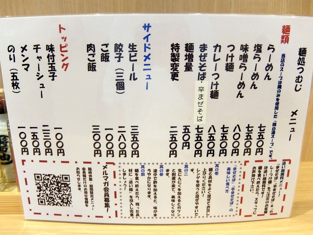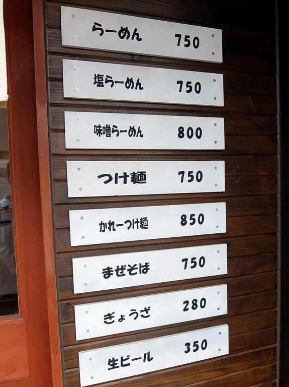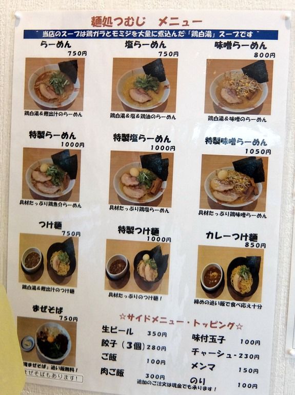主なメニューは、らーめん750円、塩らーめん750円、味噌らーめん800円、つけ麺(並盛)750円、カレーつけ麺(並盛)850円、まぜそば750円、辛まぜそば750円、他。