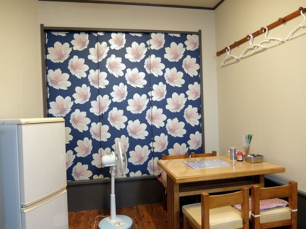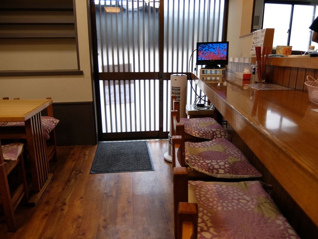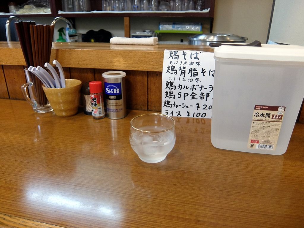 BGMはテレビ放送。日本選手メダル獲得のニュースは、思わず見入っちゃいますw お冷は、氷入りコップと冷水筒が渡されます。箸は洗い箸でエコ仕様。卓上調味料はS&B七味唐辛子・ブラックペッパー。