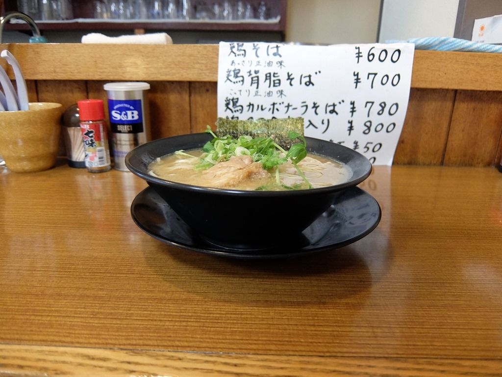 主なメニューは、鶏そば600円、鶏背脂そば700円、鶏カルボナーラそば780円、他。「鶏そば」があっさり正油で、「鶏背脂そば」がこってり正油。