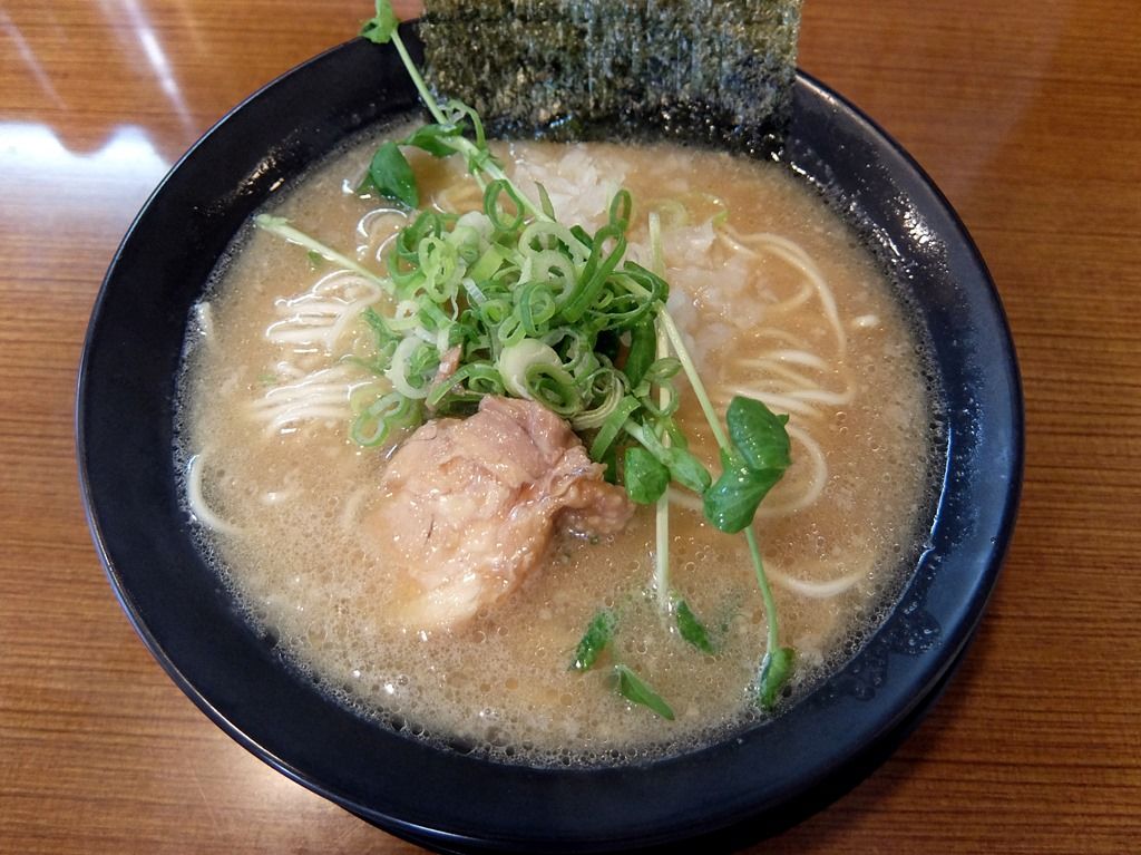 具は、鶏チャーシュー、海苔、きざみネギ、きざみ玉ねぎ、育ち過ぎの豆苗?。ネット画像では、同じメニューでも毎回具が異なるみたいです(~_~;)