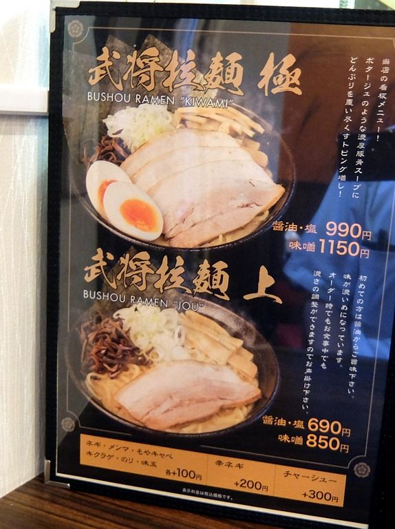 28日までは、武将拉麺 醤油・塩、油そば醤油・塩のみ各500円での提供。オーダーは、お品書き先頭の「武将拉麺 醤油」で。