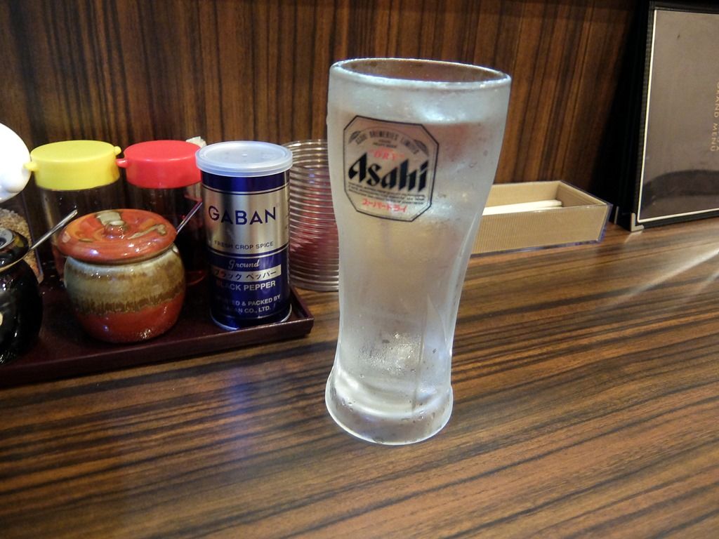 BGMはJ-POP。箸は割り箸。お冷のコップは中生グラスw