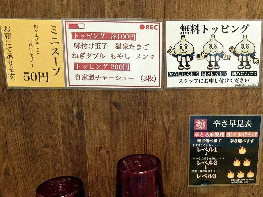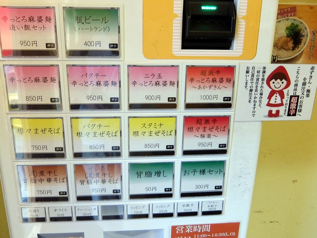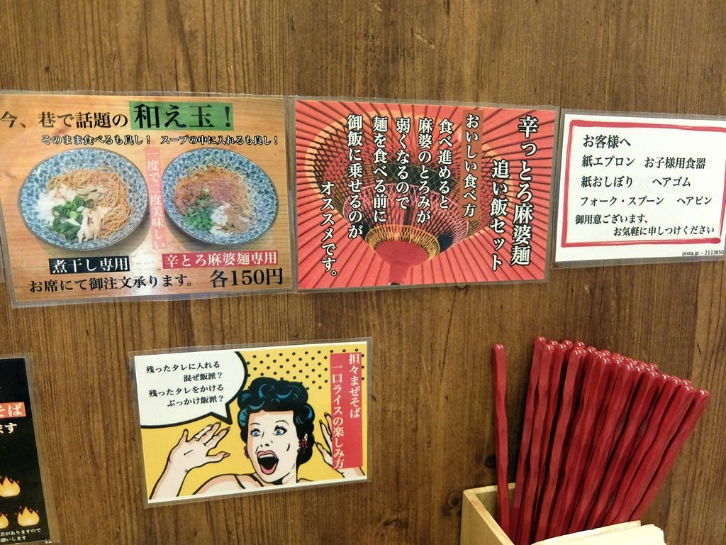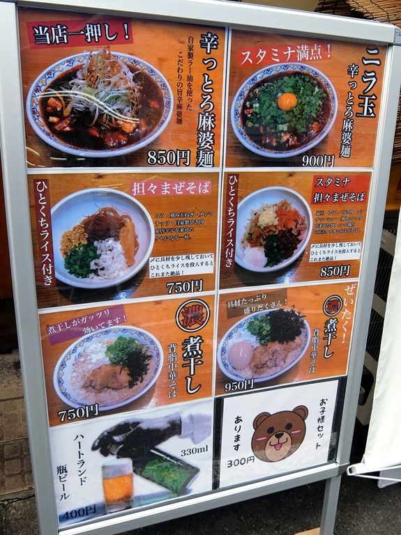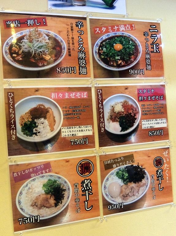 主なメニューは、辛っとろ麻婆麺850円、超激辛辛っとろ麻婆麺~あかずきん~1000円、担々まぜそば750円、超激辛担々まぜそば~極辛~950円、濃煮干し背脂中華そば750円、他。担々まぜそばは、ひとくちライス付き。