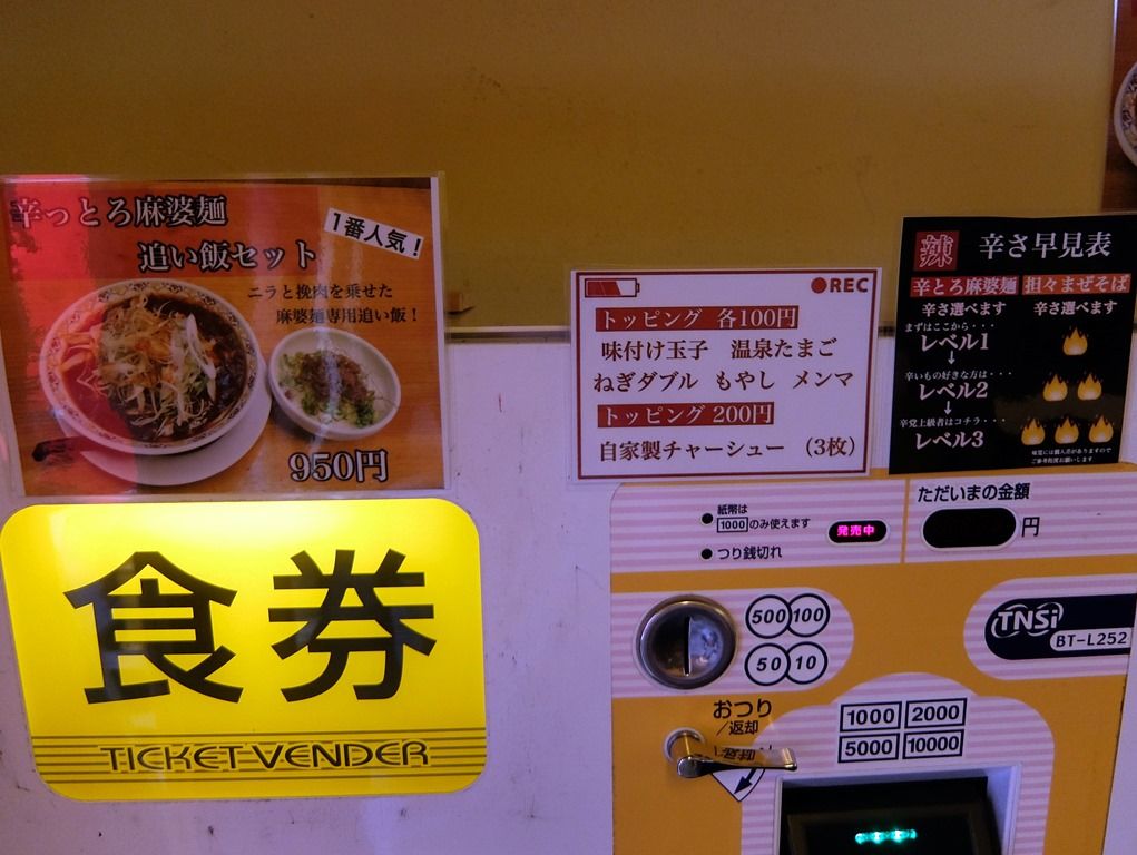 オーダーは、当店一押しという「辛っとろ麻婆麺」にしました。食券を渡すと、辛さを聞かれます。辛さは、レベル1(1辛)~レベル3(3辛)の3段階で指定可能。もちろんレベル3でw