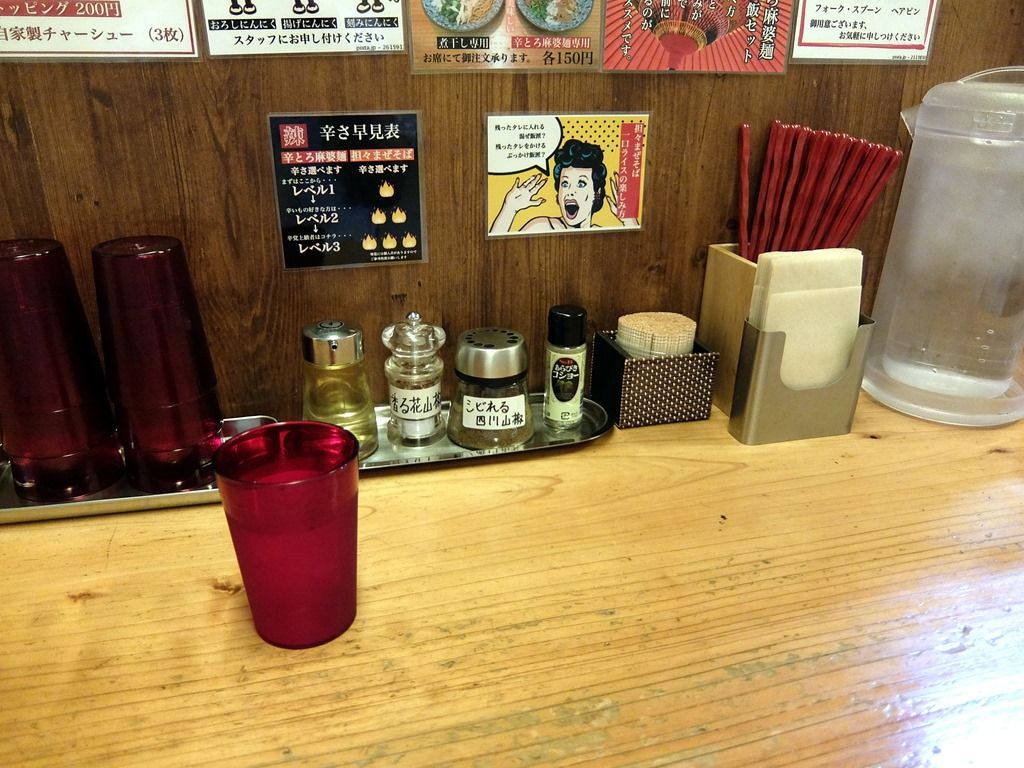 BGMはポップス。箸は洗い箸でエコ仕様。卓上調味料は、酢、香る花山椒、シビれる四川山椒、S&Bあらびきコショー。