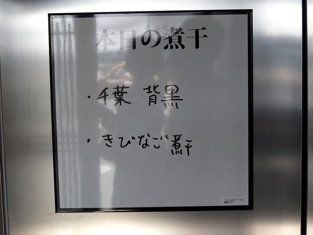 入口入って正面、冷蔵庫横に掲示のホワイトボードに「本日の煮干」の記載あり。この日は、「千葉 背黒」・「きびなご煮干」。前回は厨房内撮影禁止で、ボードの撮影を断念しましたが、こちらのボードは撮影OKだそうですので、安心してパシャリw