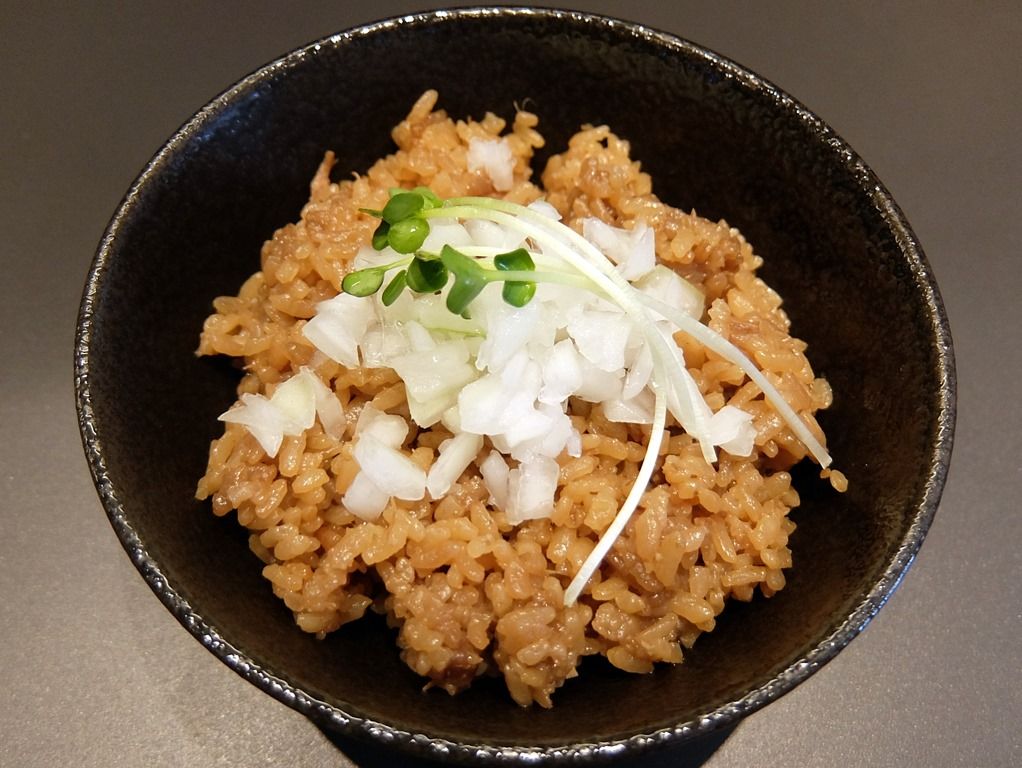 「炊き飯」。鶏出汁・チャーシューダレ・刻みチャーシューで炊いた炊き込みご飯。昼夜各15食限定。味のしっかりと染みたご飯が美味!お持ち帰りしたい旨さ!