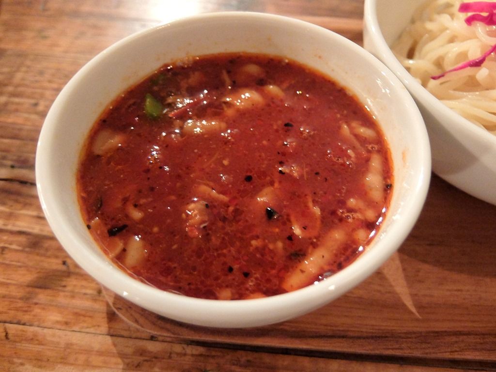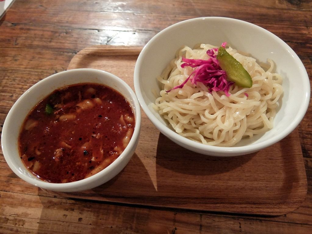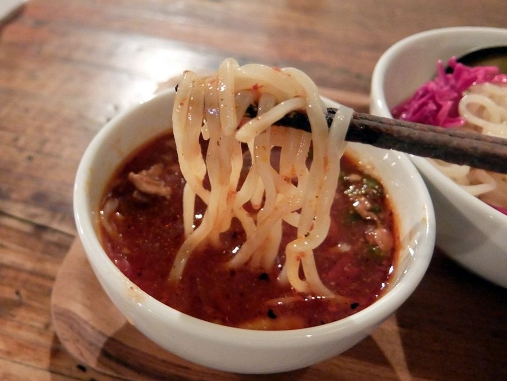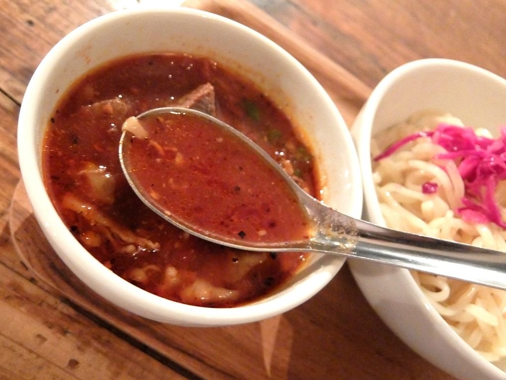 つけ汁は、とろみのある濃厚なミネストローネスープ。無化調。チリトマトと言うことで、辛味が効いています。が、想定以上に辛くてビックリ!ヌードルのイチオシなので、万人受けするチューンかと舐めてかかると、辛い目に遭いますw