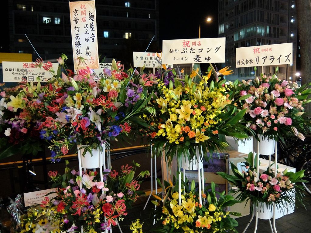 店頭には、多くの有名店からの開店祝い花。気づいたところでは、こがね家、棣鄂、煮干しつけ麺宮本、赤青MURASAKI、麺や雄、