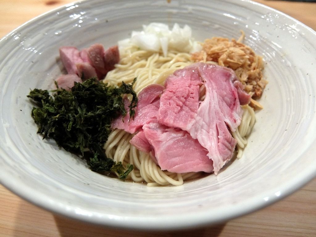 具は、チャーシュー、揚げネギ、玉ねぎ、岩海苔。なんか、トッピングが豪華!麺はまるっと一玉。麺の下に少量のスープ、タレ、油。超具沢山でこれで200円とは、注文しないともったいないおばけがw 味も煮干し風味の油そばとして絶品で、必食のサイドメニューに認定w