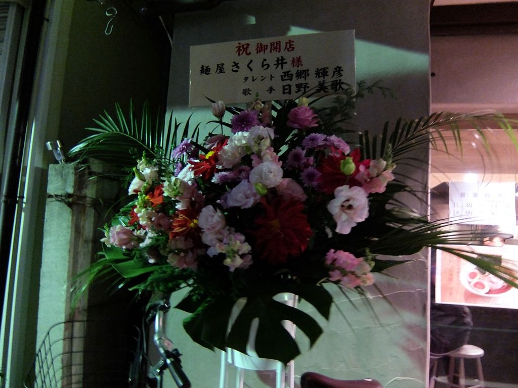 店頭には開店祝い花。既知のところでは三河屋製麺、鶴岡雅義と東京ロマンチカ、