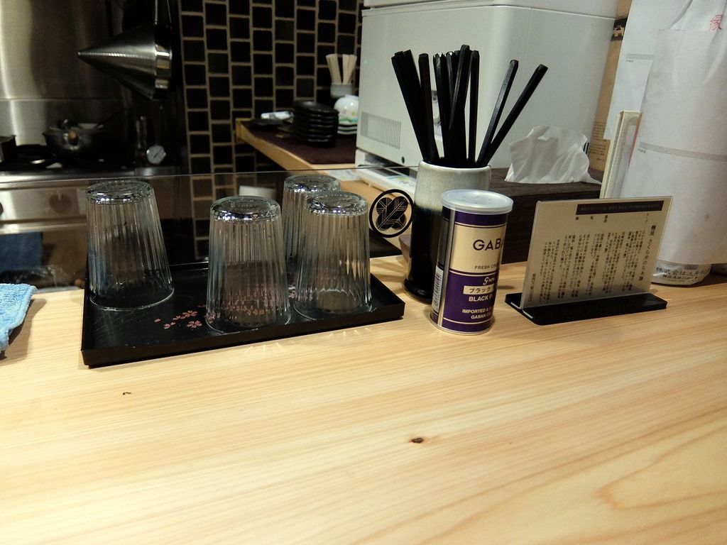 BGMは、フュージョン的な。箸は洗い箸でエコ仕様。卓上調味料は、GABANブラックペッパー。