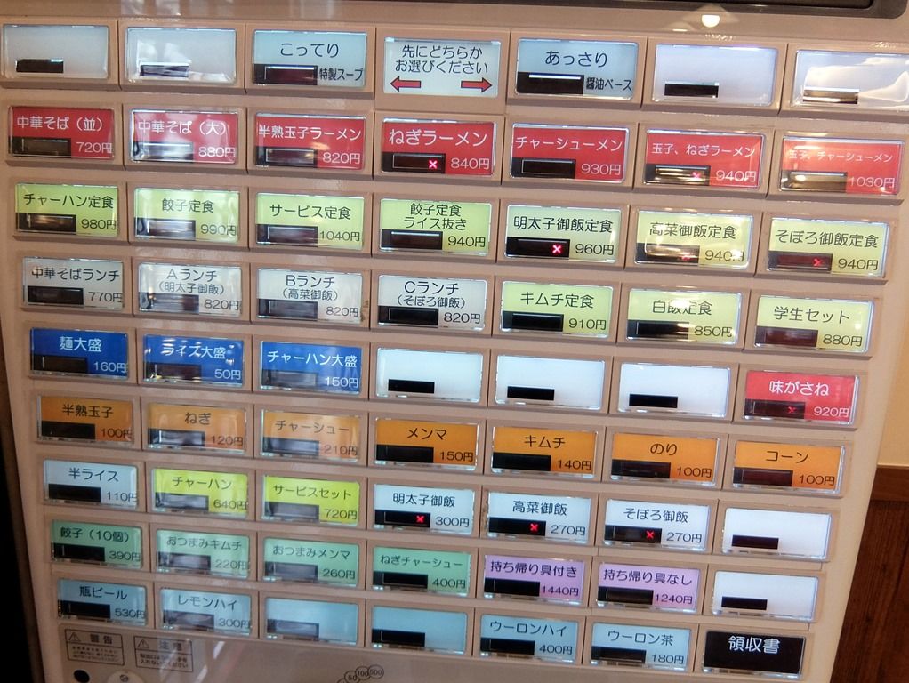 主なメニューは、中華そば(並)780円、チャーハン定食980円、餃子定食980円、他。 最初に券売機最上段中央の「こってり」か「あっさり」どちらかのボタンをポチってからメニューを選びます。