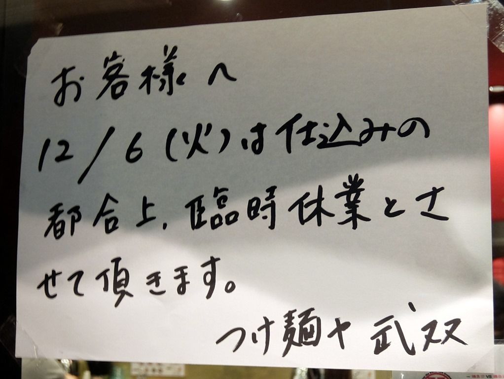 2016年12月5日、中目黒の新店「鶏魚介VS鶏白湯 武双」へ。