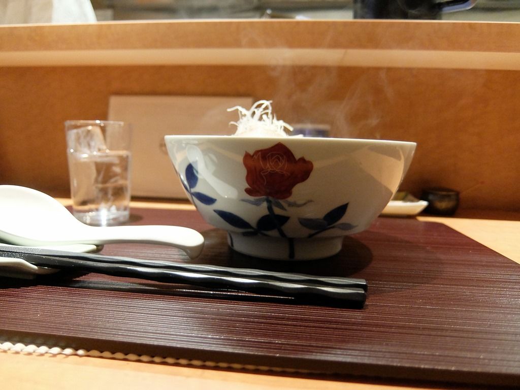 店内は、厨房を囲むL字型カウンター7席(5・2席)。後客4。ってか、ロバオさん!お久しぶり〜w 厨房には店主さんと、サポートの女性2名体制。