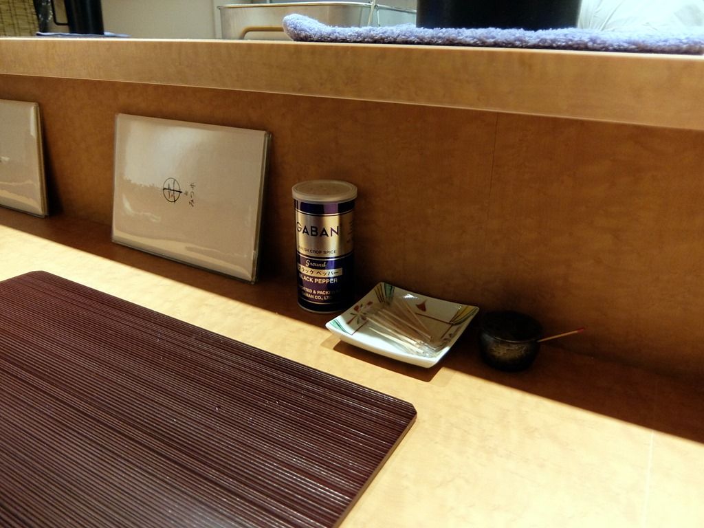 BGMは無し。カウンターにはあらかじめ木製ランチョンマットが敷かれていて、箸・蓮華置きに洗い箸とレンゲがセッティングされています。卓上調味料は、GABANブラックペッパー、一味?七味?