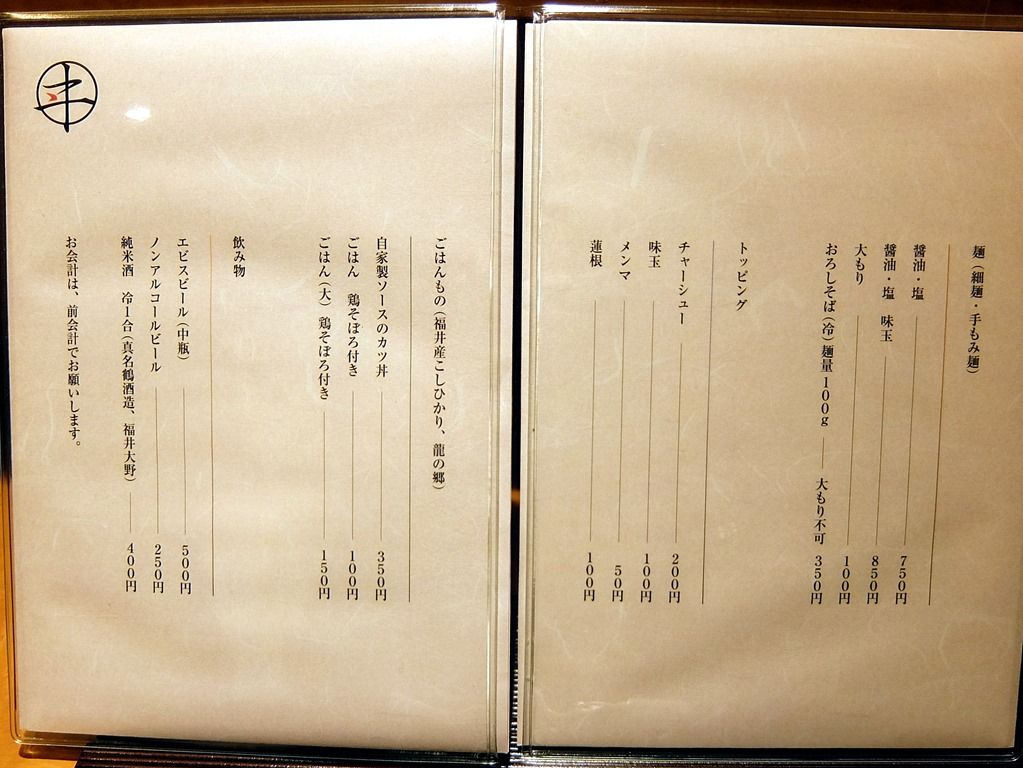 主なメニューは、醤油・塩750円、おろしそば(冷)350円、自家製ソースのカツ丼350円、他。落ち着いたら醤油・塩は、細麺・手揉み麺から選択ですが、しばらくは何も聞かれず自動的に細麺に。