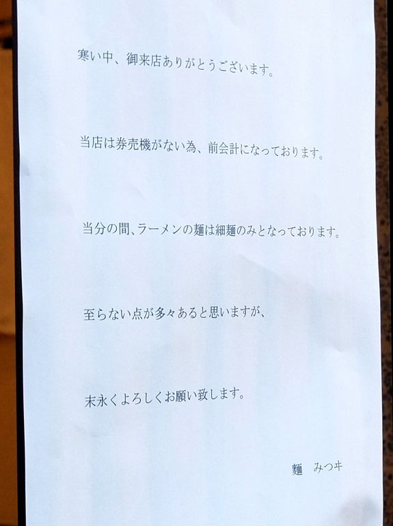 店頭掲示は、前金制、当分の間は細麺のみのインフォメーション。