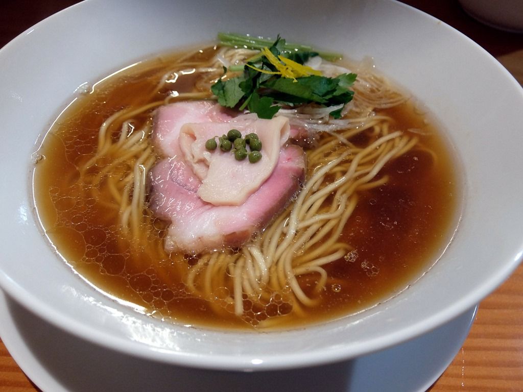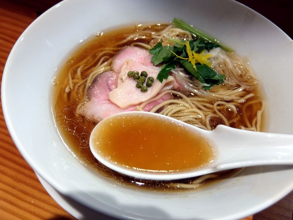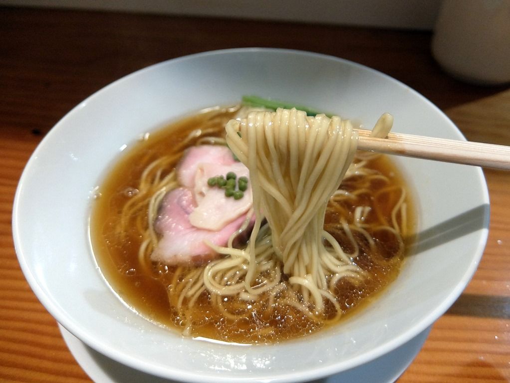 スープはさらさらの清湯醤油味。鶏の旨味と魚介のハーモニー、バランスが素晴らしく突き抜ける&ほとばしる旨さ。行列も納得の予想の斜め上を行くスーパクオリティで、凄く美味しい!