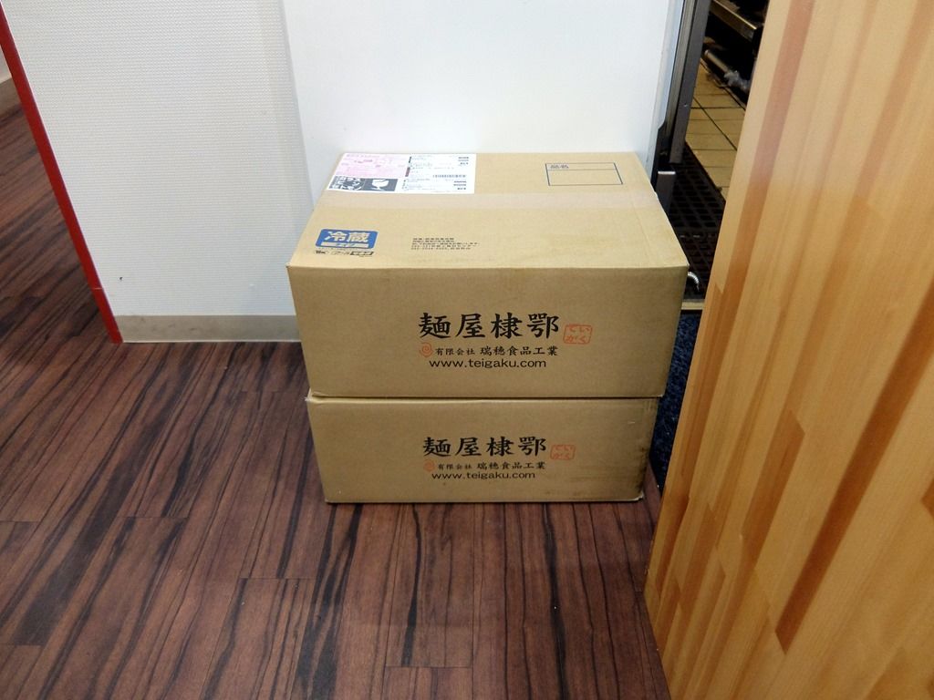 2階へ上がる階段の前には、まさ吉からの開店祝花。厨房の出入口には麺屋棣鄂のダンボール。