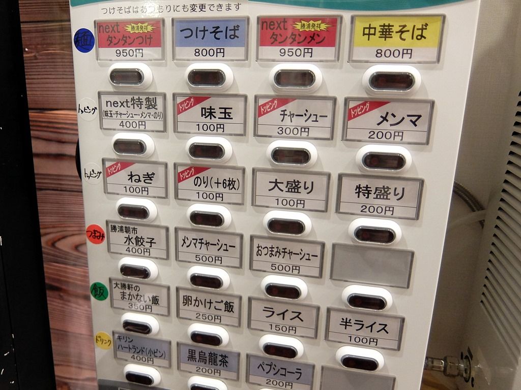 入店すると、まず券売機で食券購入です。主なメニューは、つけそば800円、中華そば800円、nextタンタンメン950円、nextタンタンつけ950円、勝浦朝一水餃子400円、他。