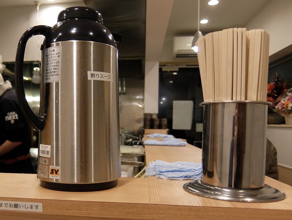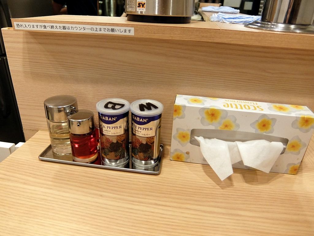 BGMはJ-WAVE。明日は今シーズン一番の寒気が居座り、真冬のような厳しい寒さの予報で、ラジオからは「粉~雪ぃ~♪」のメロディがw カウンター上にはつけそば用割りスープと割り箸。卓上調味料は、GABANブラックペッパー・ホワイトペッパー。