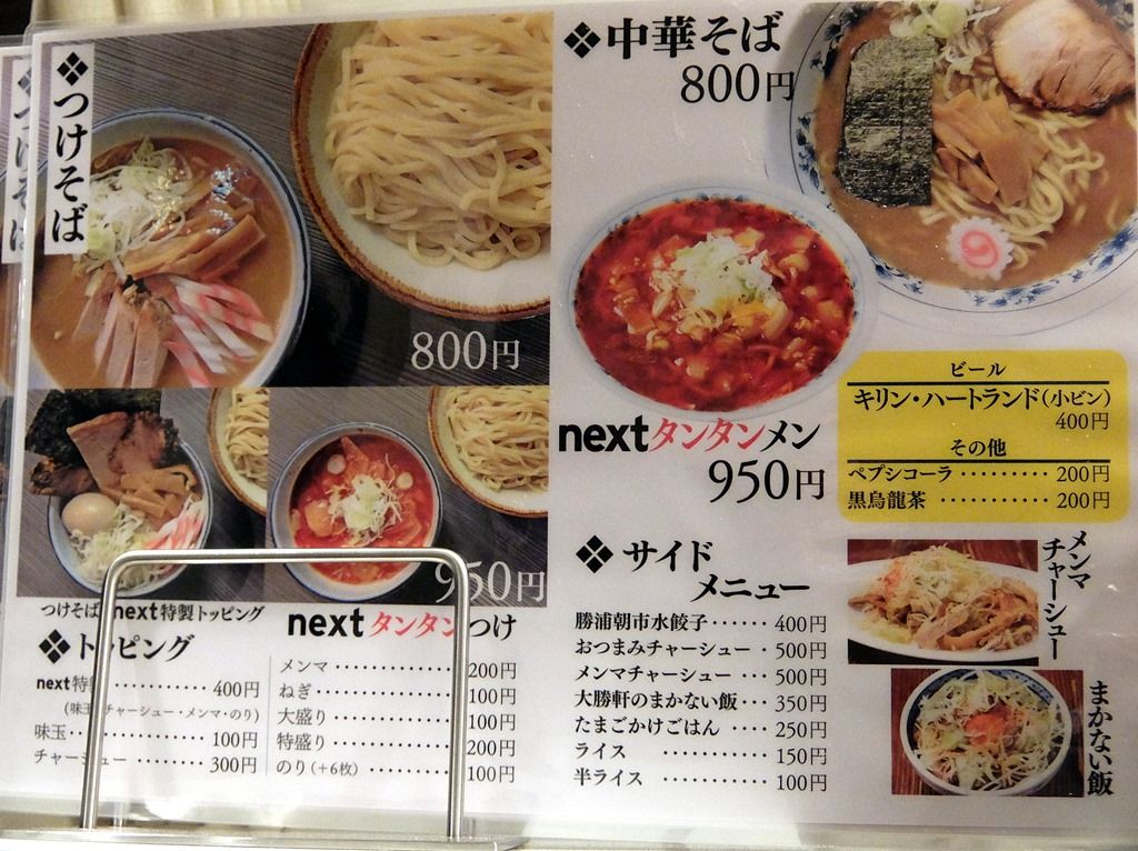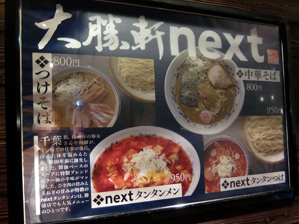 大勝軒の「つけそば」・「中華そば」と、nextタンタンの2枚看板。「nextタンタンメン」は、勝タンインスパイアな一杯。「nextタンタンつけ」はつけそばバージョン。「勝浦タンタンメン」が商標登録され、正規取扱店以外での表記が禁止されたため、改名に至った模様。