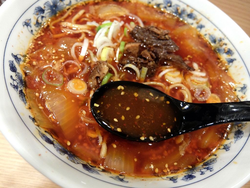 スープは、さらさらの清湯ラー油味w 辛め指定でラー油たっぷり。ベースは「中華そば」のスープと思いますが、炒め玉ねぎの風味と甘み、加熱したラー油の香ばしさと辛味が渾然一体となって、中毒性の高い癖になる味わいに。勝タンは、勝浦の漁師さん・海女さんが海で冷えた身体を暖めるのに広がったと聞きますが、なるほど胃から身体がポカポカと温まって、後半汗が吹き出してきます。寒い日にはうってつけの旨辛で、とっても美味しい!