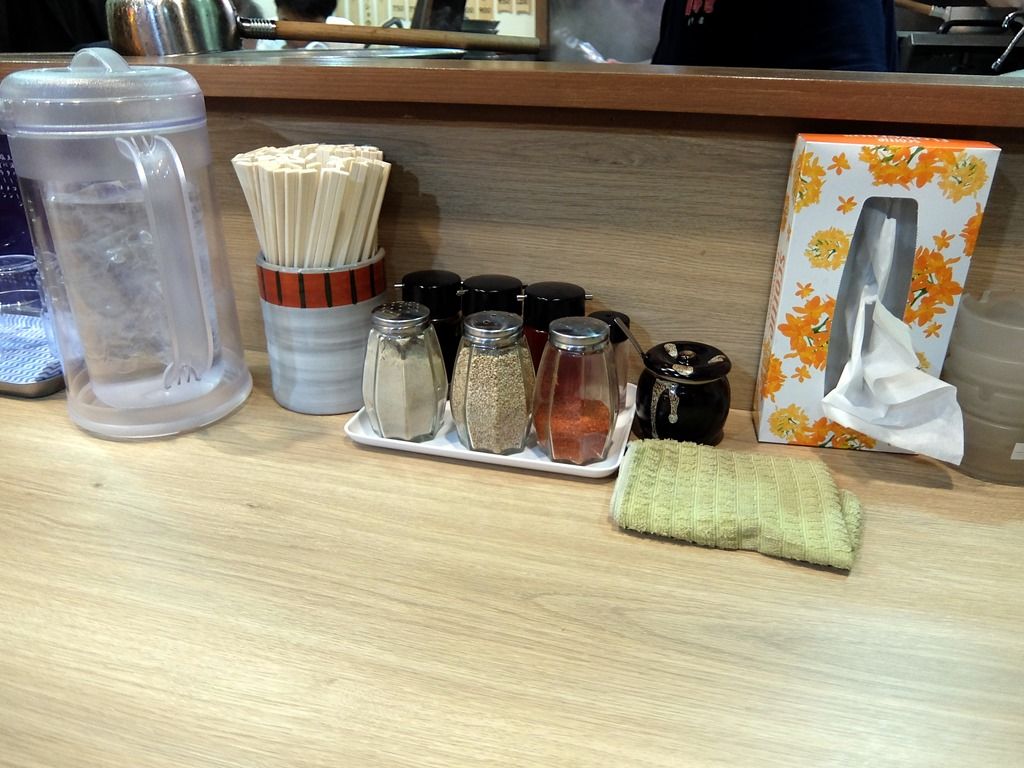 BGMはポップス。箸は割り箸。卓上調味料は、胡椒、胡麻、一味唐辛子、醤油、酢、ラー油、到着壺の中身は自家製らしき辛味調味料。