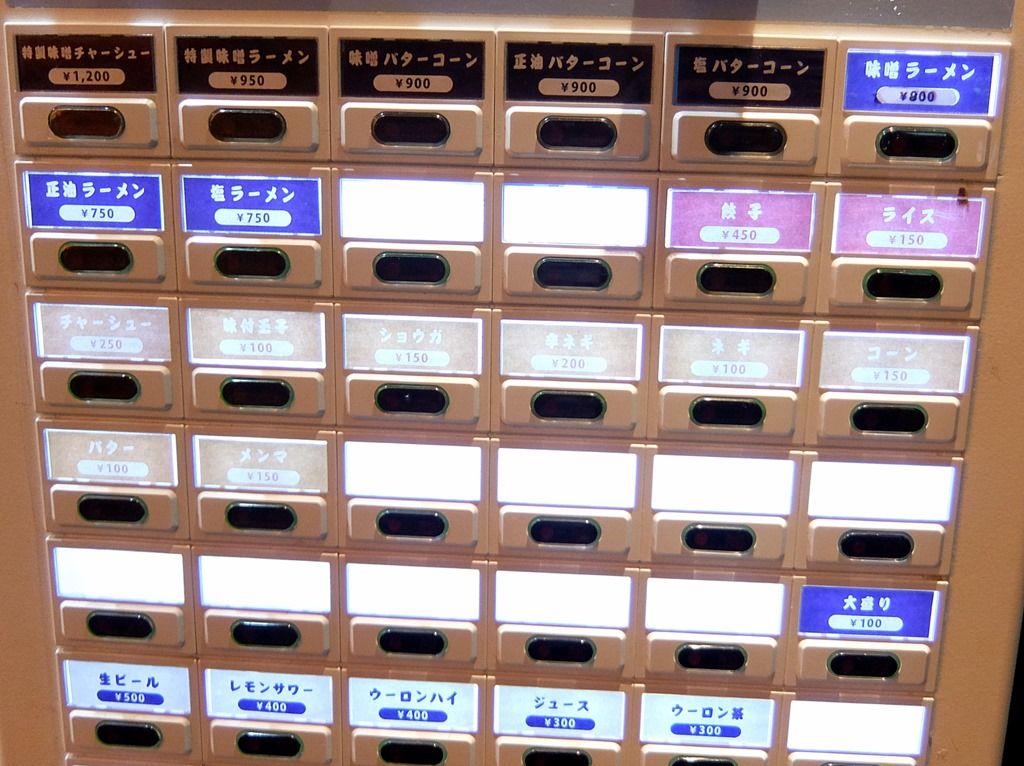 入店前にまず店外店頭券売機で食券購入です。主なメニューは、味噌ラーメン800円、正油ラーメン750円、塩ラーメン750円、他。