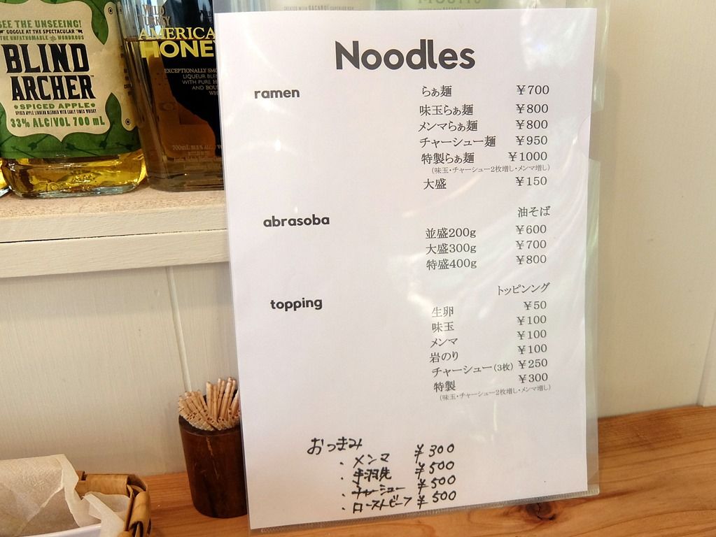 券売機は無く後会計制。主なメニューは、らぁ麺700円、油そば 並盛200g 600円、他。新メニューの納豆らぁ麺・納豆油そば+150円が登場してました!オーダーは、ベースメニューの「らぁ麺」で。