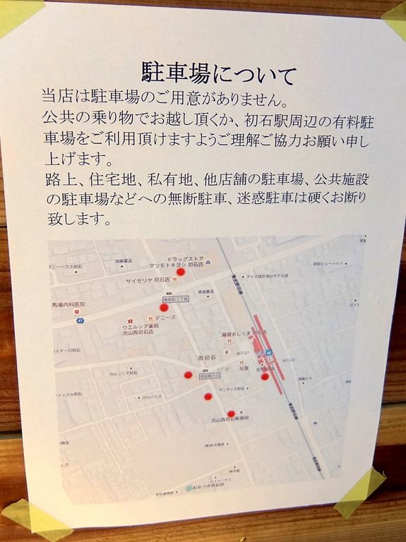 店の駐車場はありませんが、店頭に近隣の有料駐車場の案内掲示。前2回は電車で間に合わなかったので、今回は車でw NaviParkの駐車場が40分200円でした。