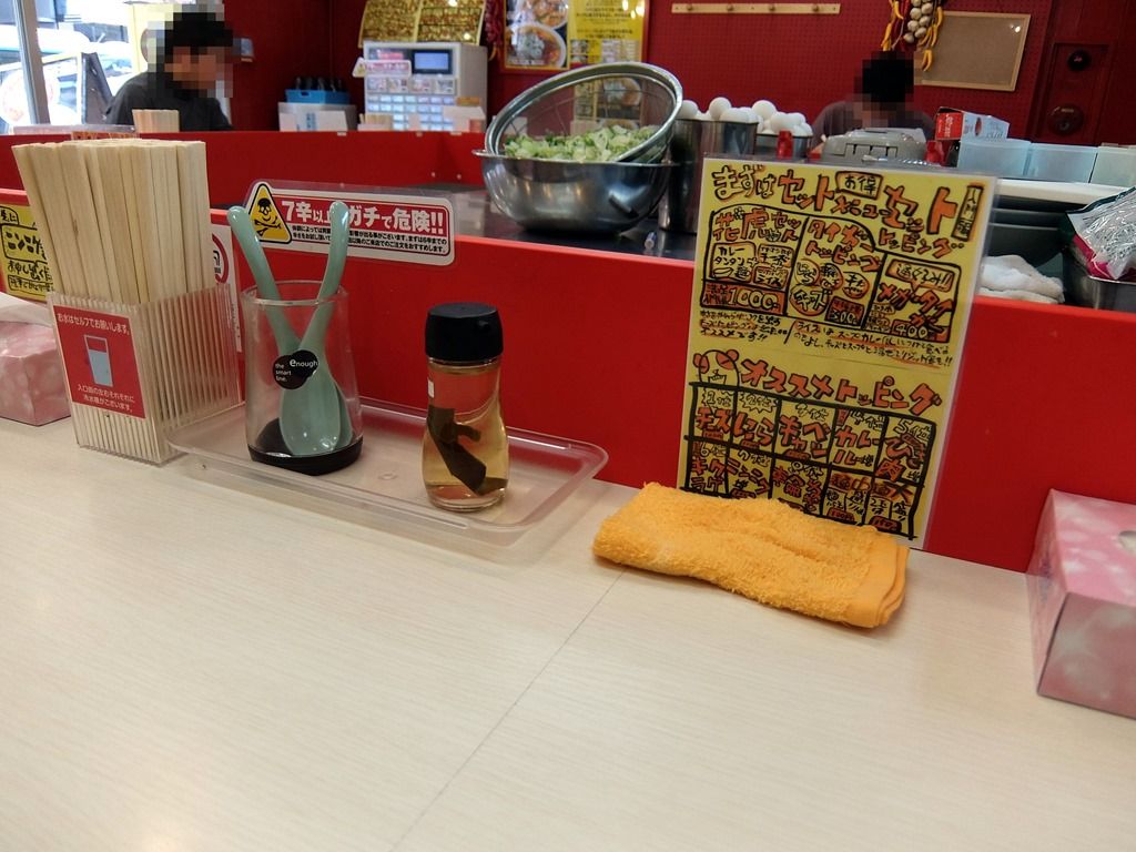 BGMはJ-Pop。箸は割り箸。卓上調味料は酢。