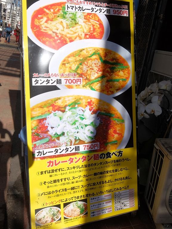 主なメニューは、カレータンタン麺750円、タンタン麺700円、トマトカレータンタン麺950円、鷄塩白湯麺780円、他。辛さは1~2辛無料、3辛10円、4辛20円、5辛30円、6辛40円、7辛50円、7辛以上100円で、辛さUP券を券売機で購入する方式。
