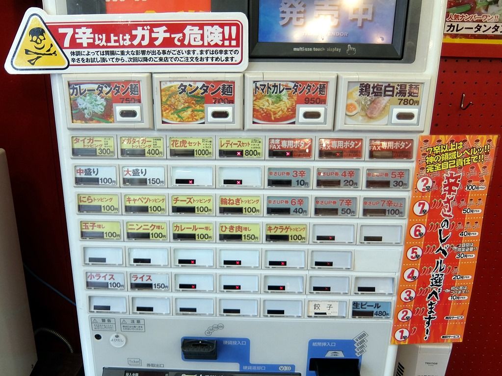 オーダーは、券売機先頭左端の「カレータンタン麺」に。食券を渡すと、辛さとニンニクの有無を聞かれます。本店で7辛にしたところカレーの味がまるでしなくなったので、今回はおとなしく2辛で(^^ゞ ニンニクも無しに。