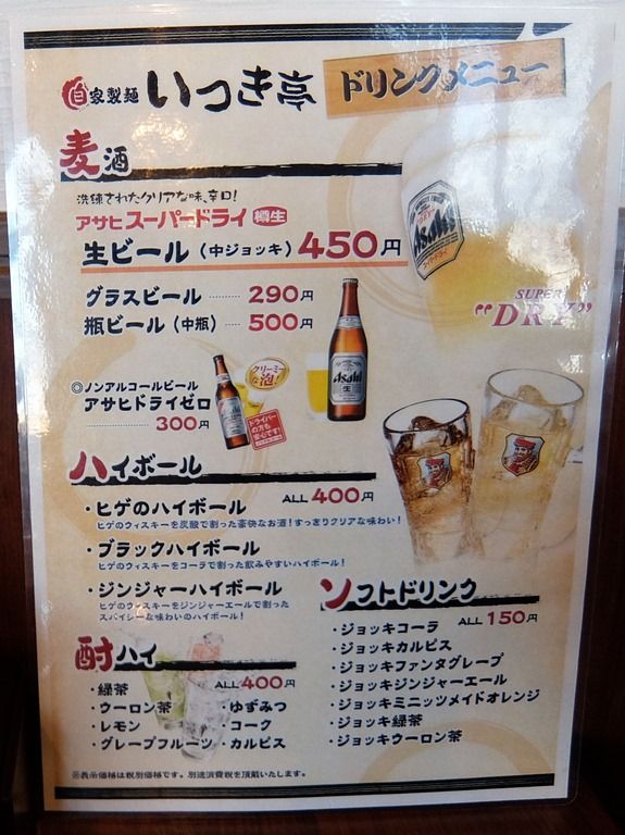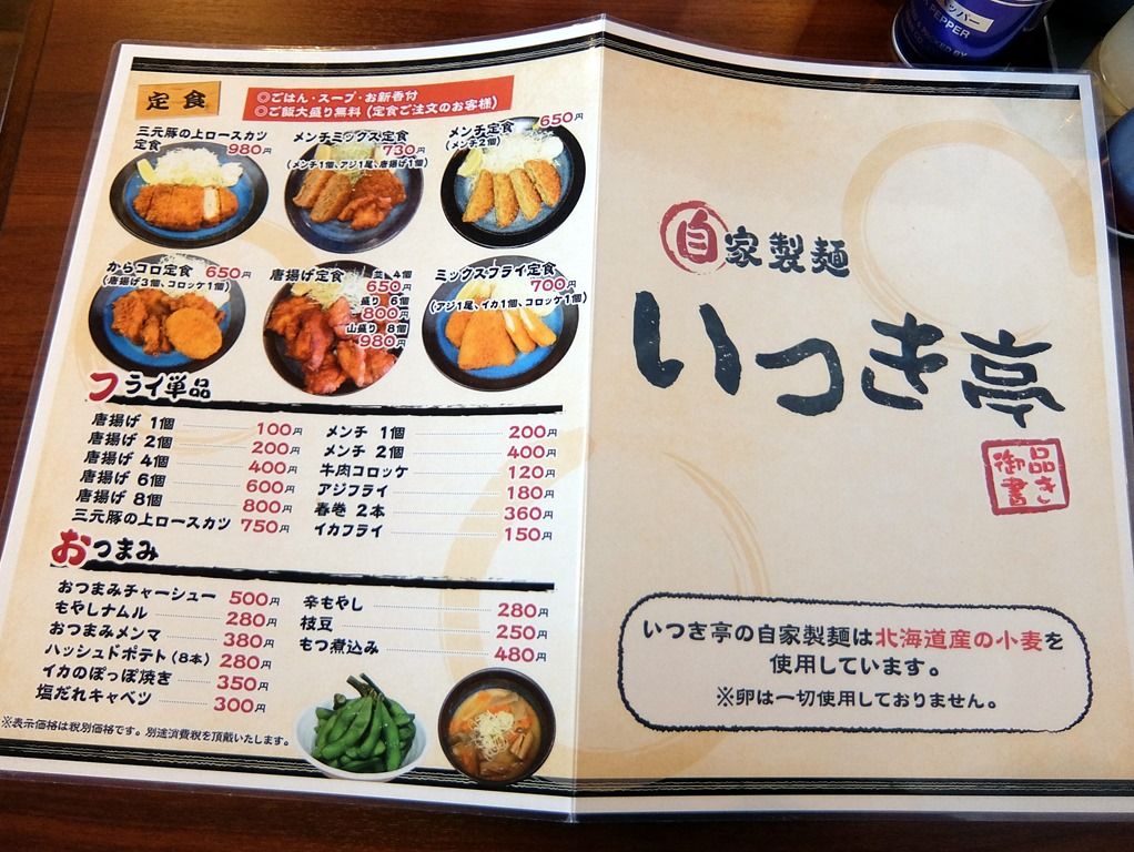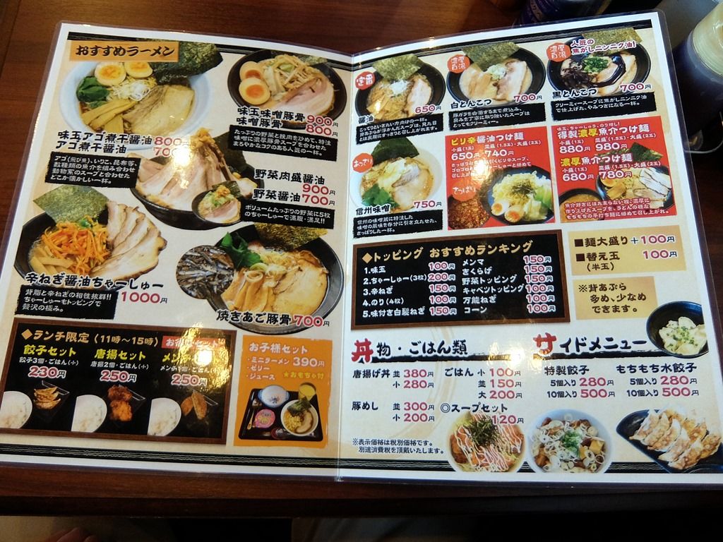 主な麺メニューは、アゴ煮干醤油700円、焼きアゴ豚骨700円、味噌豚骨800円、醤油650円、白とんこつ700円、黒とんこつ700円、信州味噌750円、ピリ辛の醤油つけ麺1玉650円、濃厚魚介つけ麺1玉680円、他